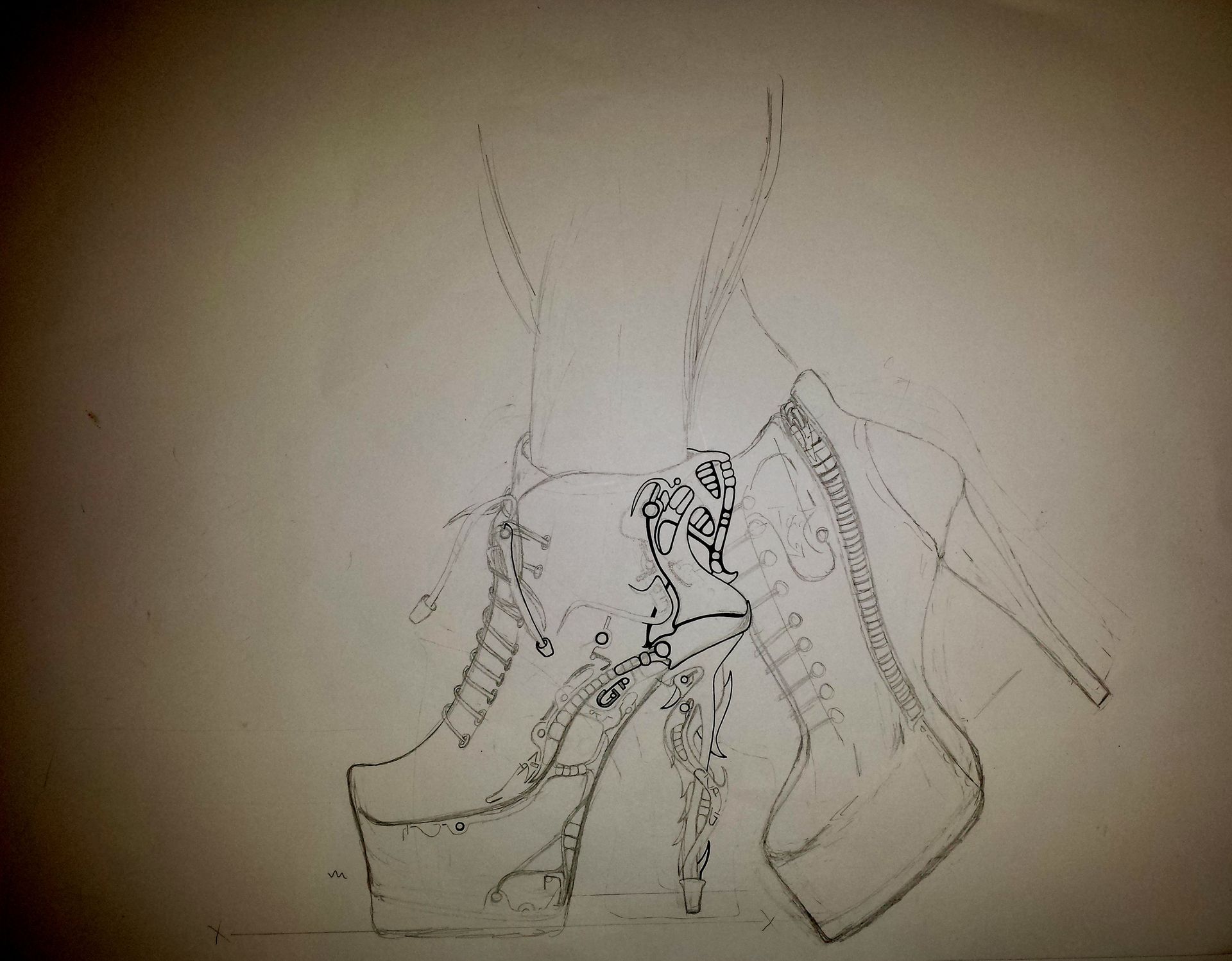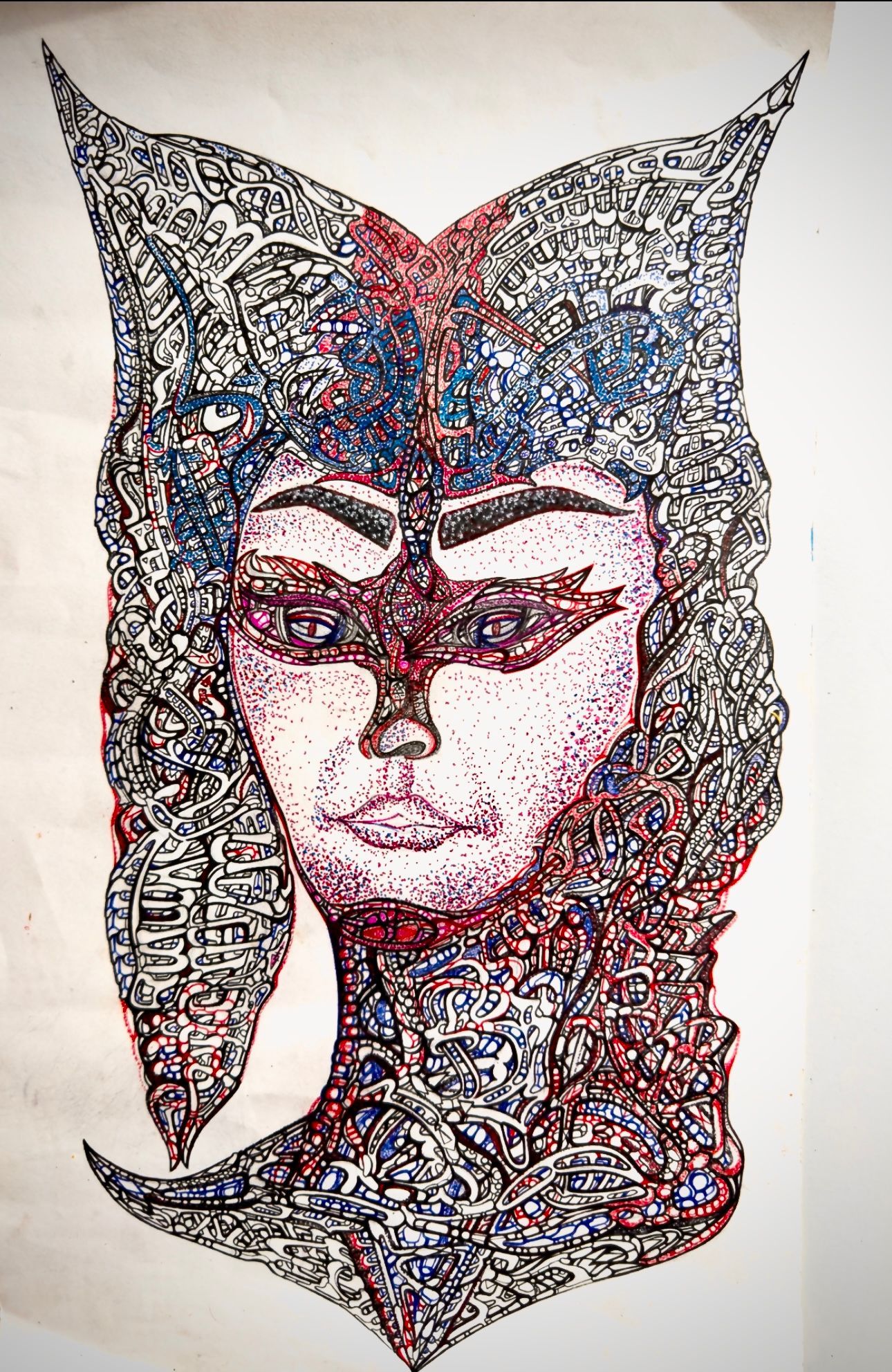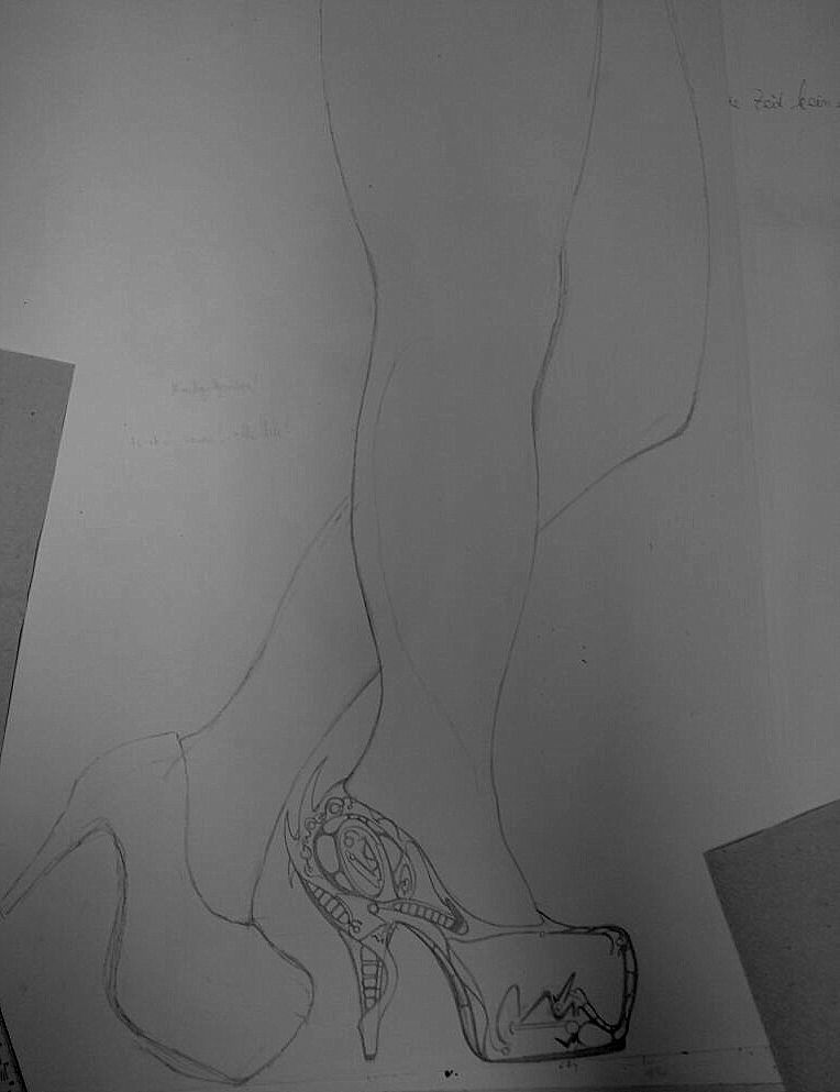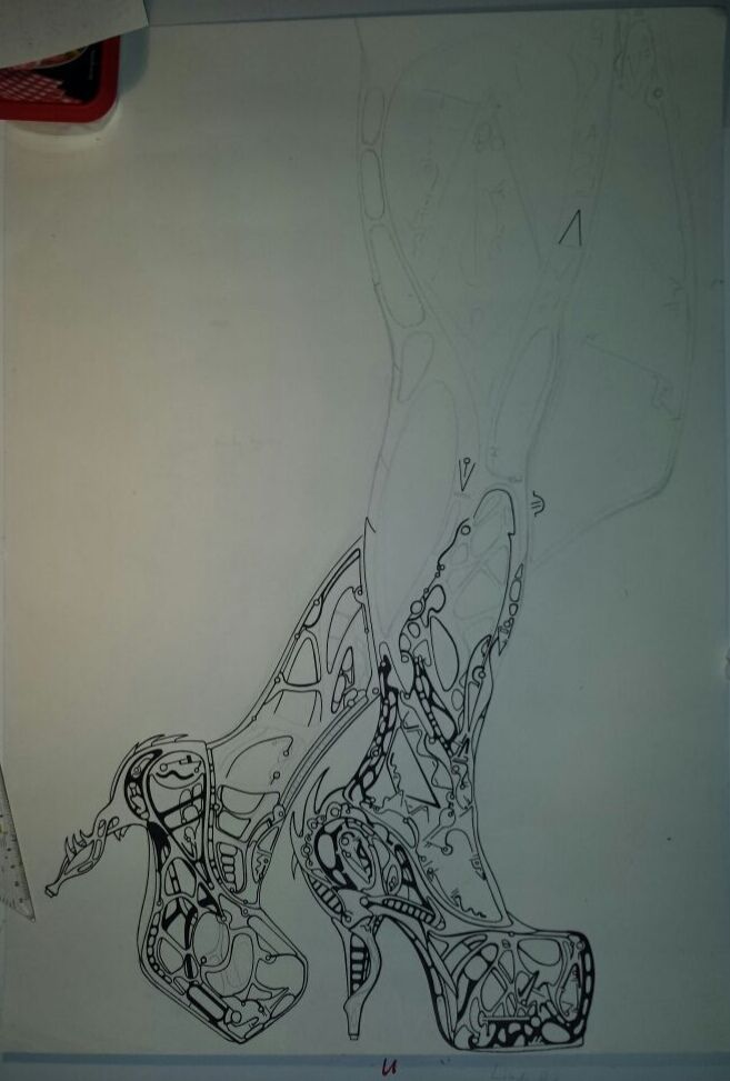Dieses Bild ist ein spezieller Auftrag gewesen, es ging darum, die Real existierenden Beine samt den Schuhen des Models in meinem Stil wiederzugeben. Das ist für die Auftraggeberin am wichtigsten gewesen. Was meine Muster den Stil, alles, was man sieht, betrifft, so kann ich diesbezüglich das eine sagen, das es intuitiv kommt. Die verschiedenartigen Muster, das Sylische, kommt einfach. Es ergibt sich im Laufe der Arbeit. Wobei mir persönlich bei dem Projekt wichtig war, das man einen Zusammenhang erkennt.