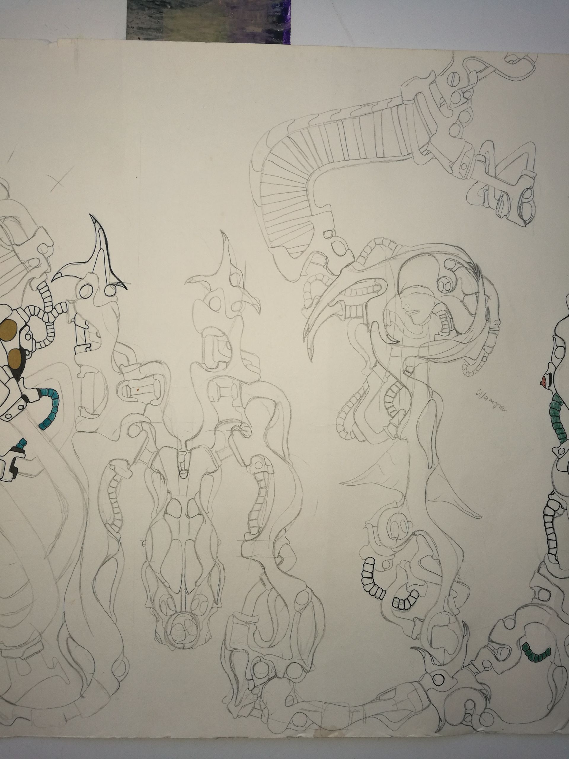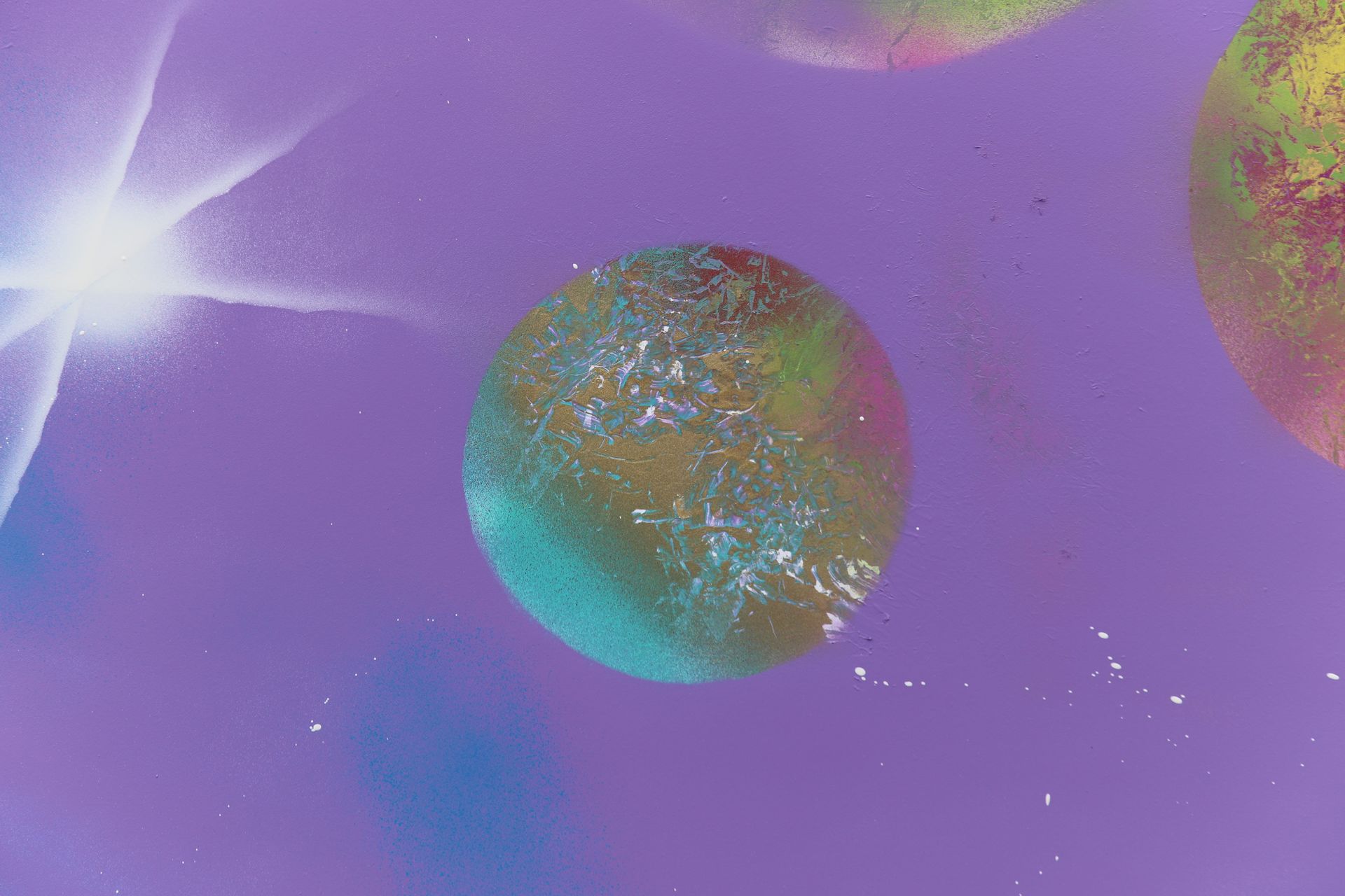 Dieses Projekt war eine Gemeinschaftsarbeit von insgesamt vier Künstler:innen, wobei einer auf eigenen Wunsch ausgestiegen ist. Die Gründe dafür sind unbekannt und nicht relevant für den Text. Ich selbst habe die Arbeiten am Bramscher Bahnhof, dem Tor in Quakenbrück, dem Kloster in Fürstenau, den Windrädern, den Planeten (einer wurde in Schwarz-Weiß gestaltet) sowie dem UFO (was letztendlich nur für unbekannte Flugobjekte steht) und dem Strahl (der keine Verwendung fand) gestaltet und umgesetzt. Vor der Bearbeitung habe ich die Leinwand kreisrund abgeklebt. Die Farben und der Aufstrich wurden von einem Künstlerkollegen und Freund übernommen. Im Nachhinein sind wir zufrieden.