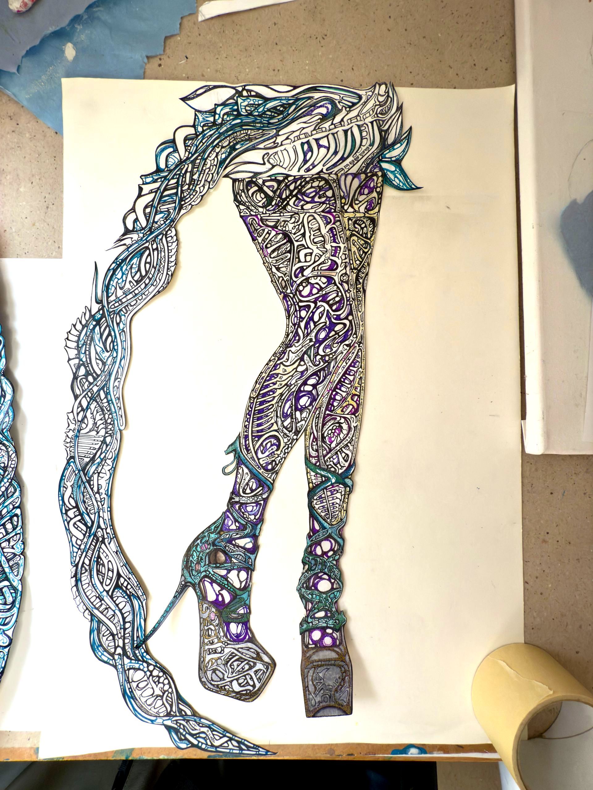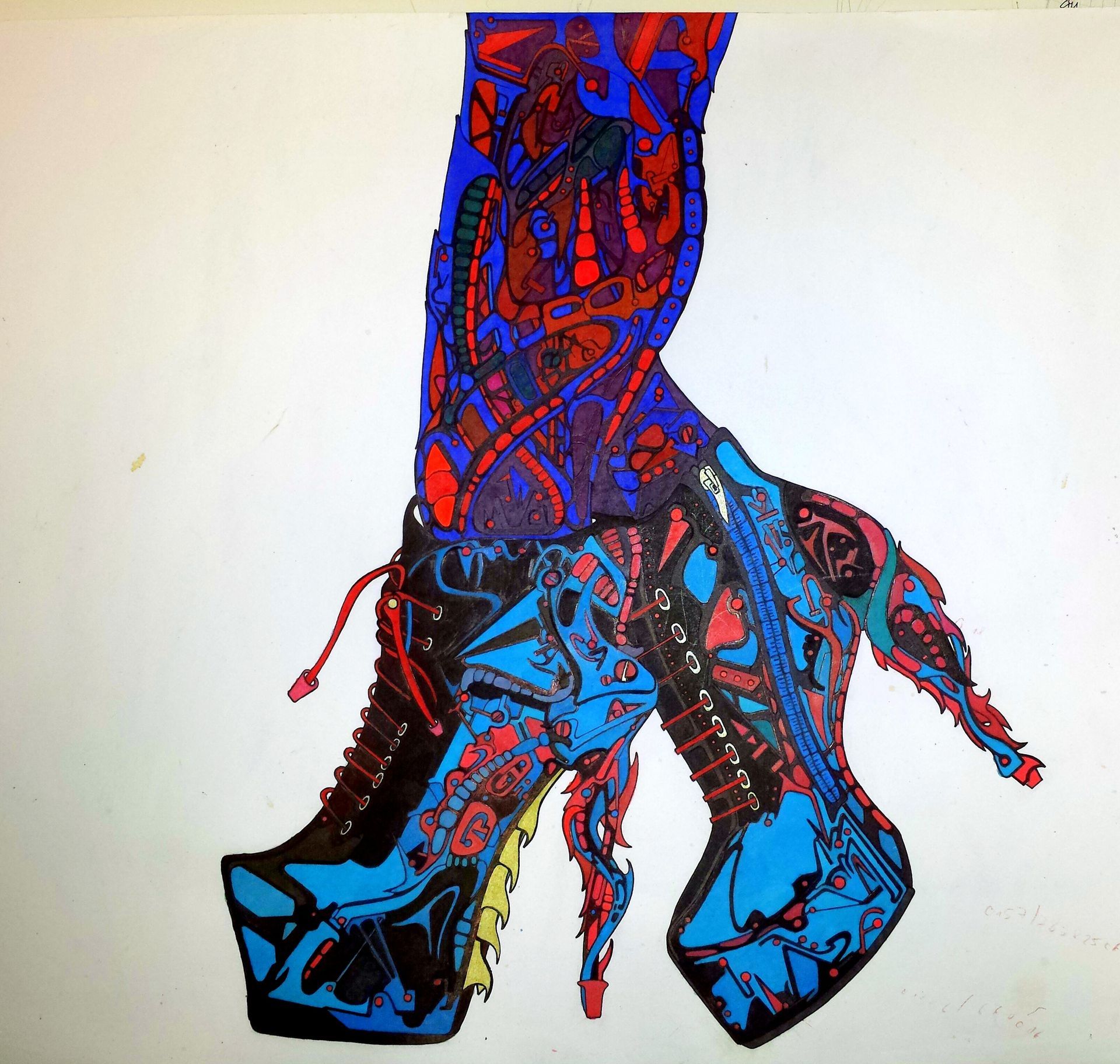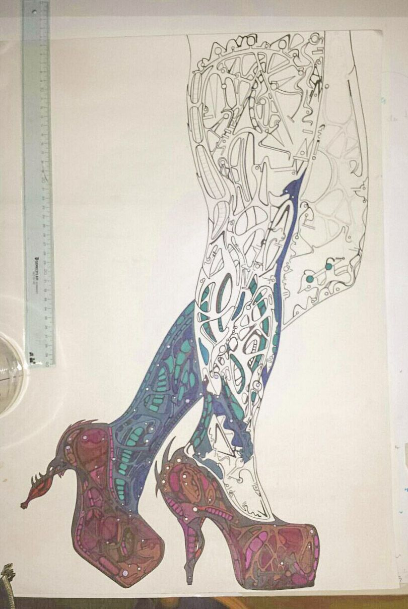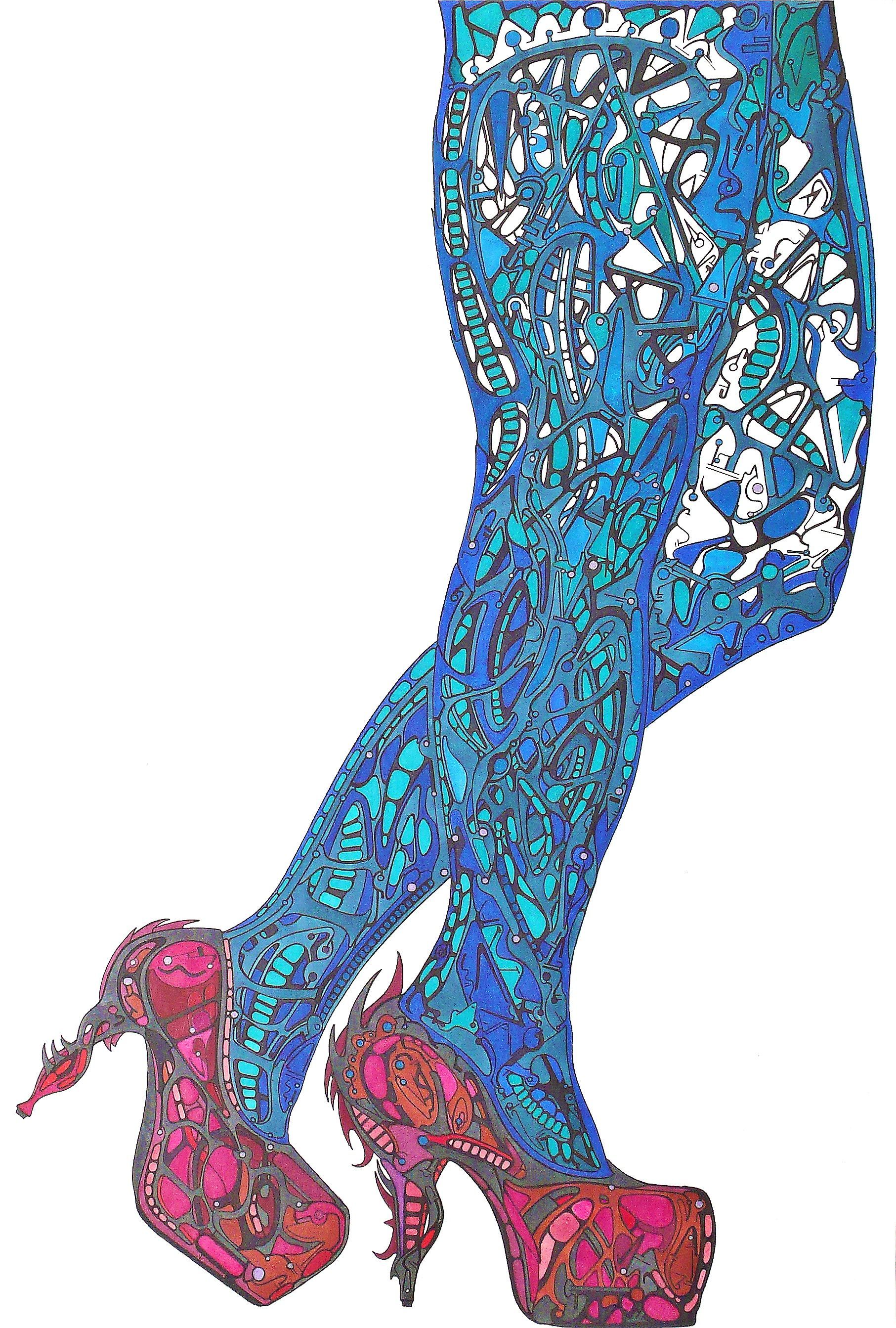 Dieses Bild ist ein spezieller Auftrag gewesen, es ging darum, die Real existierenden Beine samt den Schuhen des Models in meinem Stil wiederzugeben. Das ist für die Auftraggeberin am wichtigsten gewesen. Was meine Muster den Stil, alles, was man sieht, betrifft, so kann ich diesbezüglich das eine sagen, das es intuitiv kommt. Die verschiedenartigen Muster, das Sylische, kommt einfach. Es ergibt sich im Laufe der Arbeit. Wobei mir persönlich bei dem Projekt wichtig war, das man einen Zusammenhang erkennt.