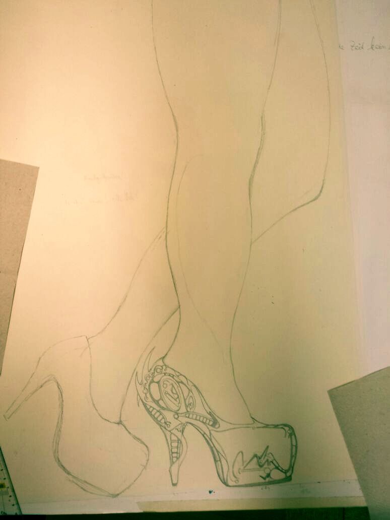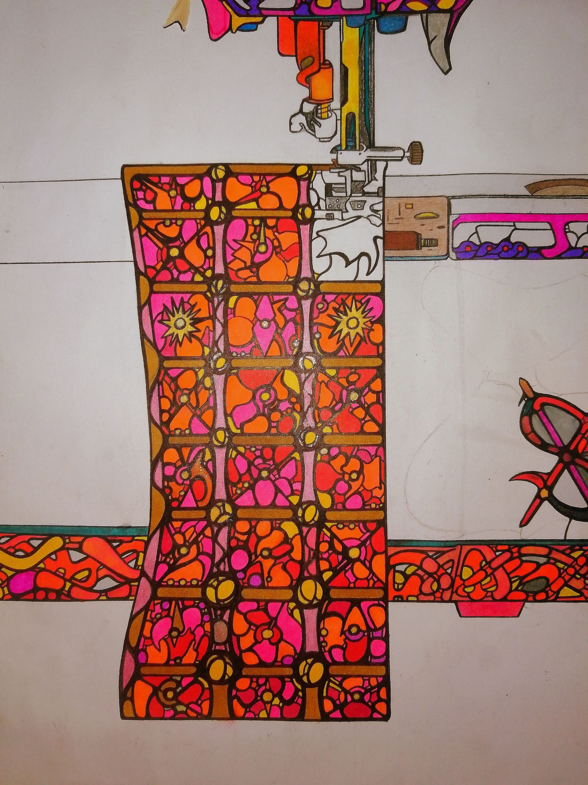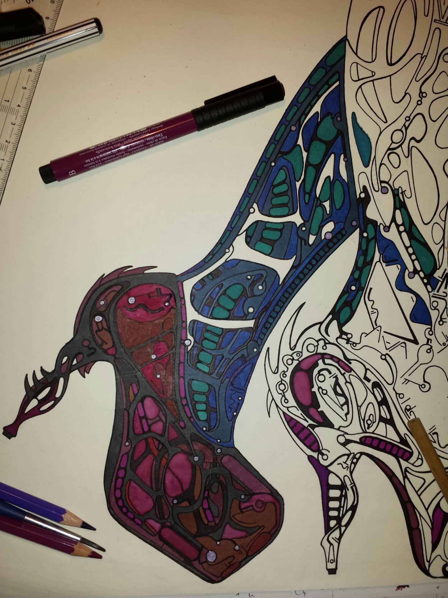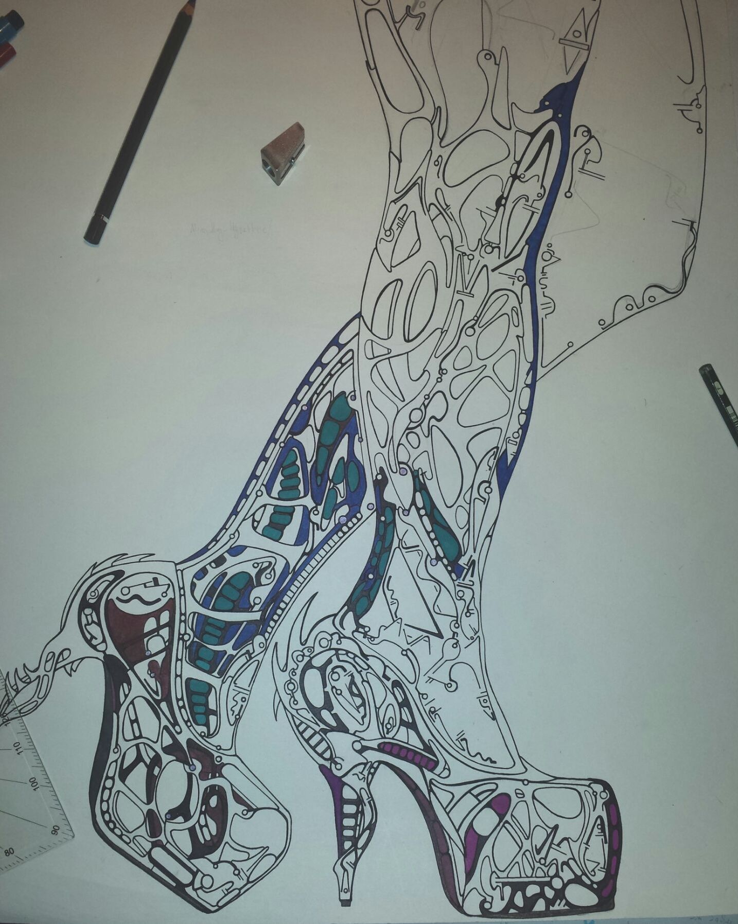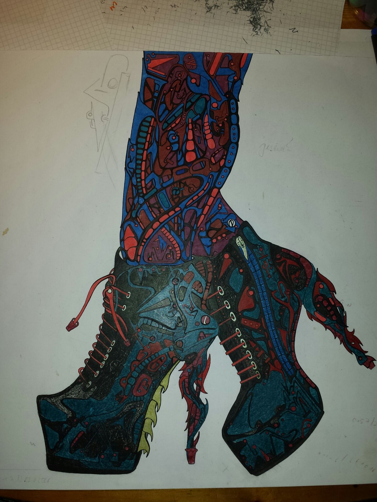 Dieses Bild ist ein spezieller Auftrag gewesen, es ging darum, die Real existierenden Beine samt den Schuhen des Models in meinem Stil wiederzugeben. Das ist für die Auftraggeberin am wichtigsten gewesen. Was meine Muster den Stil, alles, was man sieht, betrifft, so kann ich diesbezüglich das eine sagen, das es intuitiv kommt. Die verschiedenartigen Muster, das Sylische, kommt einfach. Es ergibt sich im Laufe der Arbeit. Wobei mir persönlich bei dem Projekt wichtig war, das man einen Zusammenhang erkennt.