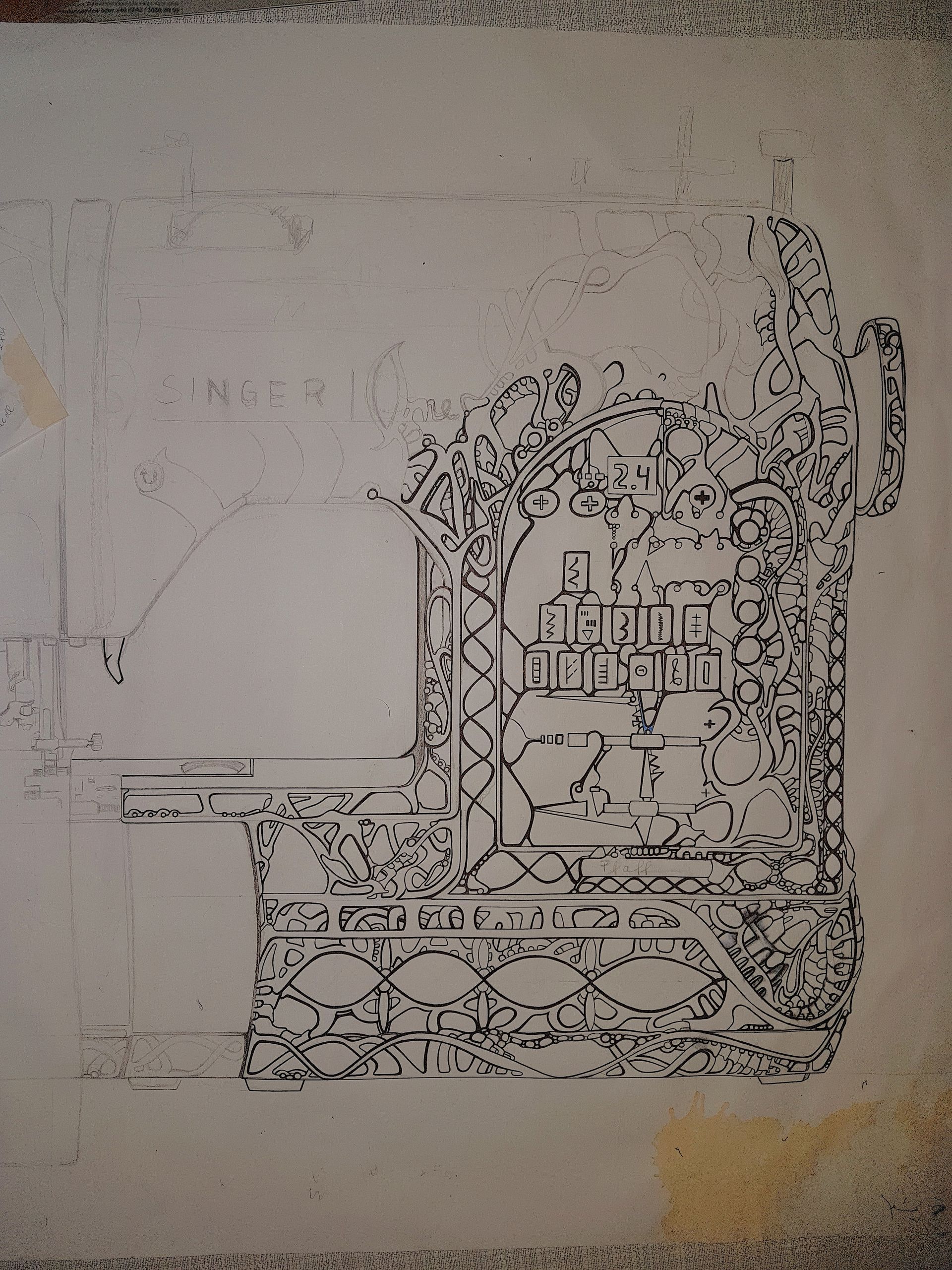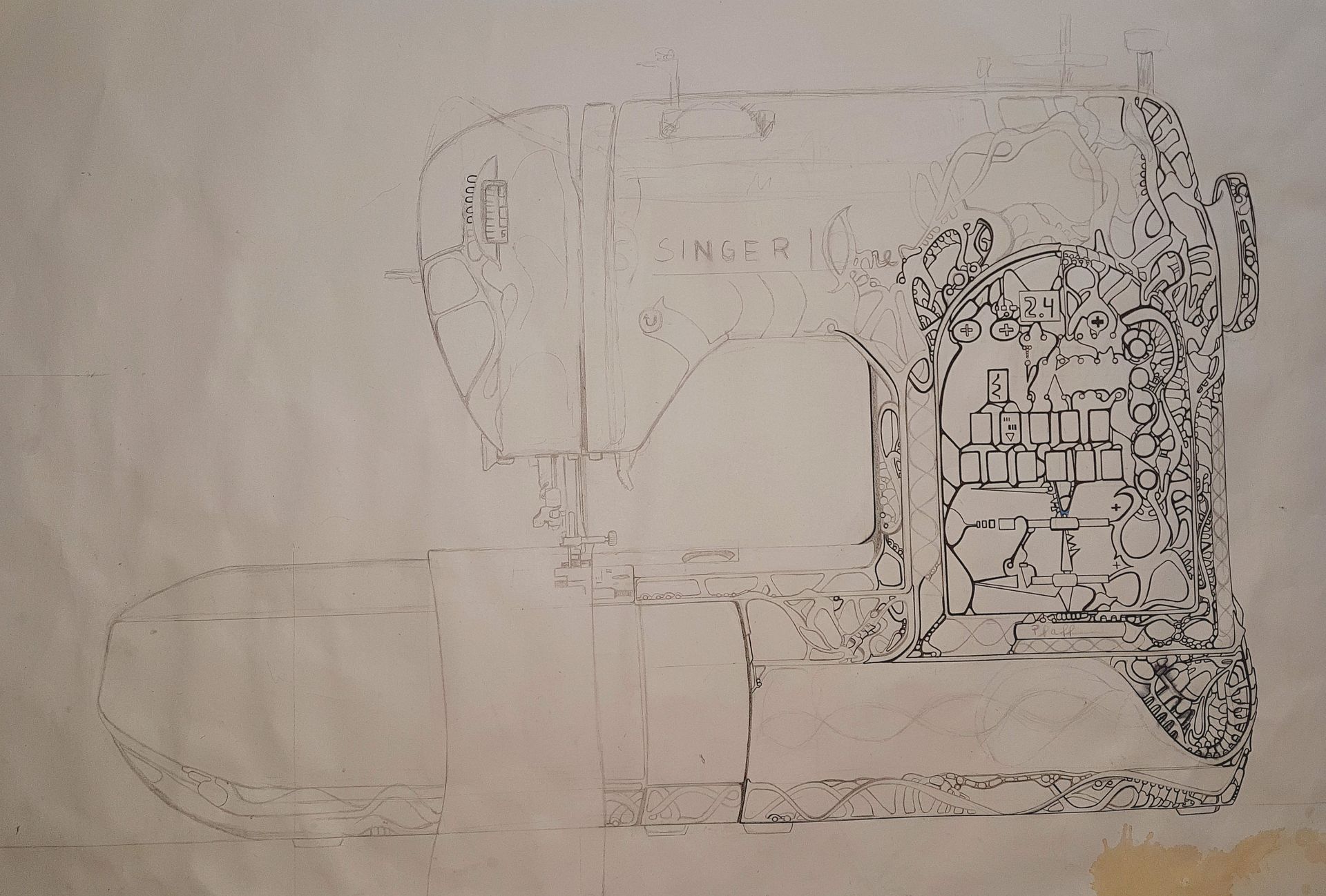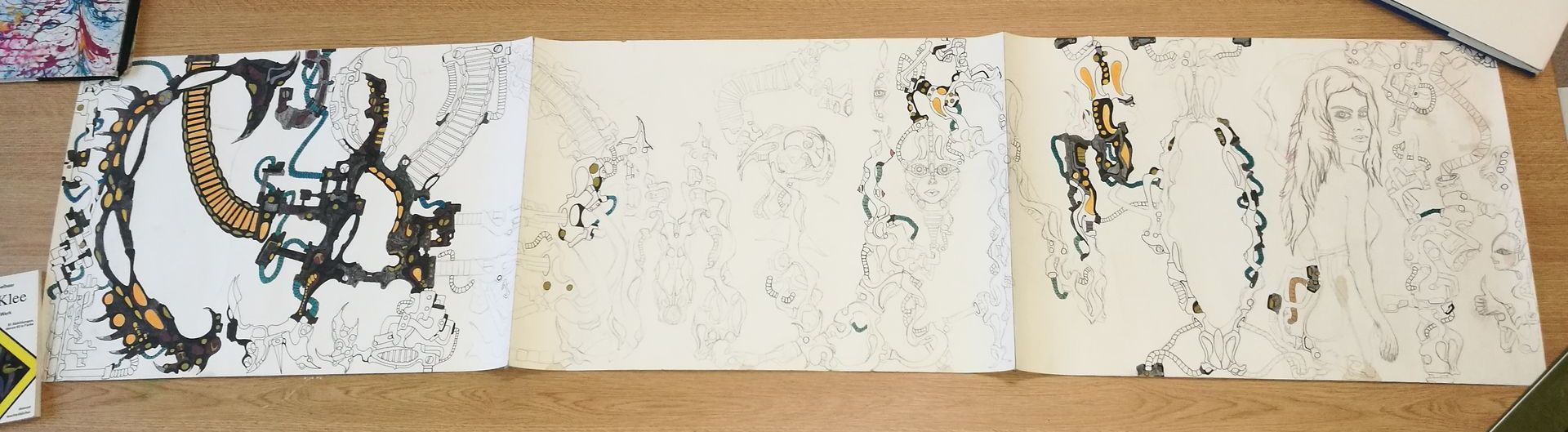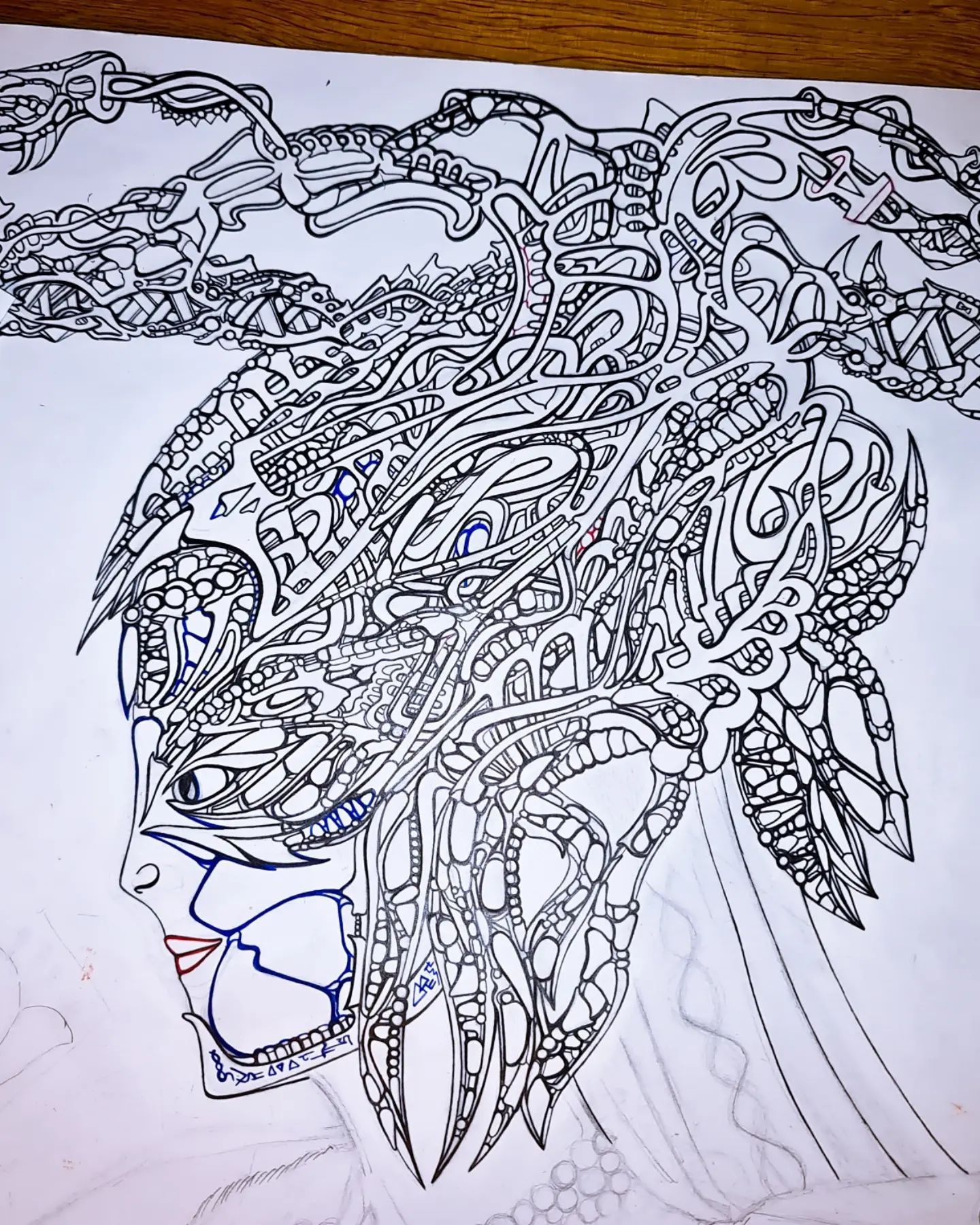 Dieses Bild ist ein spezieller Auftrag gewesen, es ging darum, die Real existierenden Beine samt den Schuhen des Models in meinem Stil wiederzugeben. Das ist für die Auftraggeberin am wichtigsten gewesen. Was meine Muster den Stil, alles, was man sieht, betrifft, so kann ich diesbezüglich das eine sagen, das es intuitiv kommt. Die verschiedenartigen Muster, das Sylische, kommt einfach. Es ergibt sich im Laufe der Arbeit. Wobei mir persönlich bei dem Projekt wichtig war, das man einen Zusammenhang erkennt.