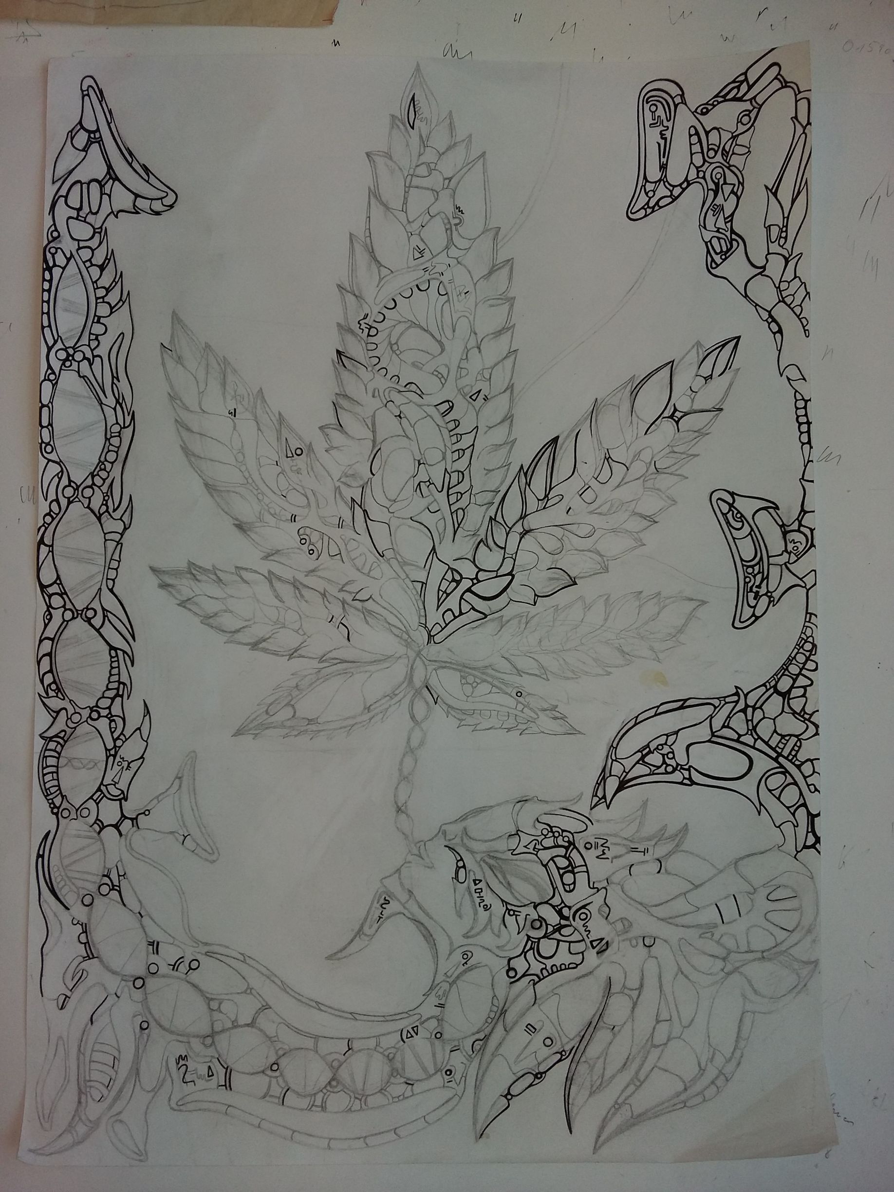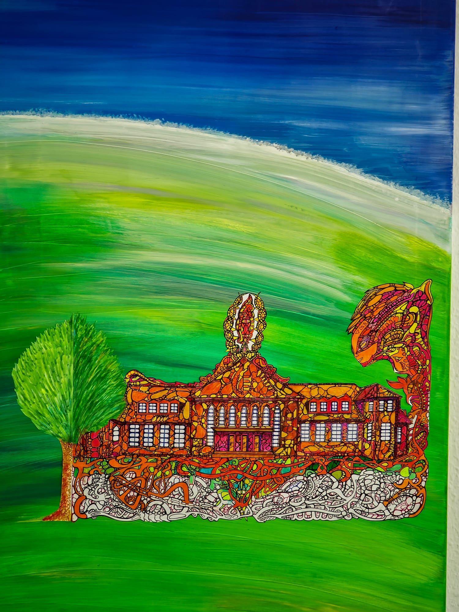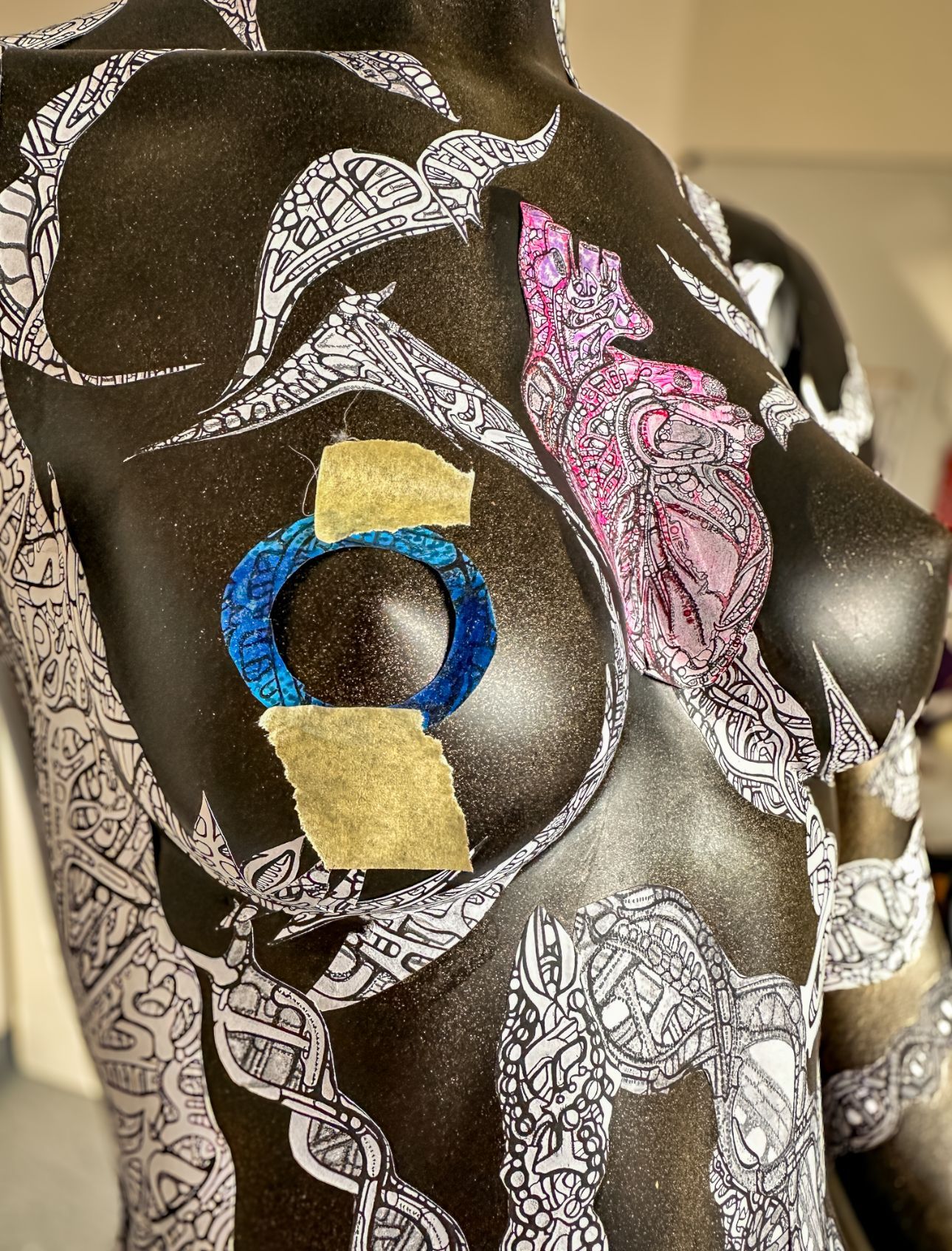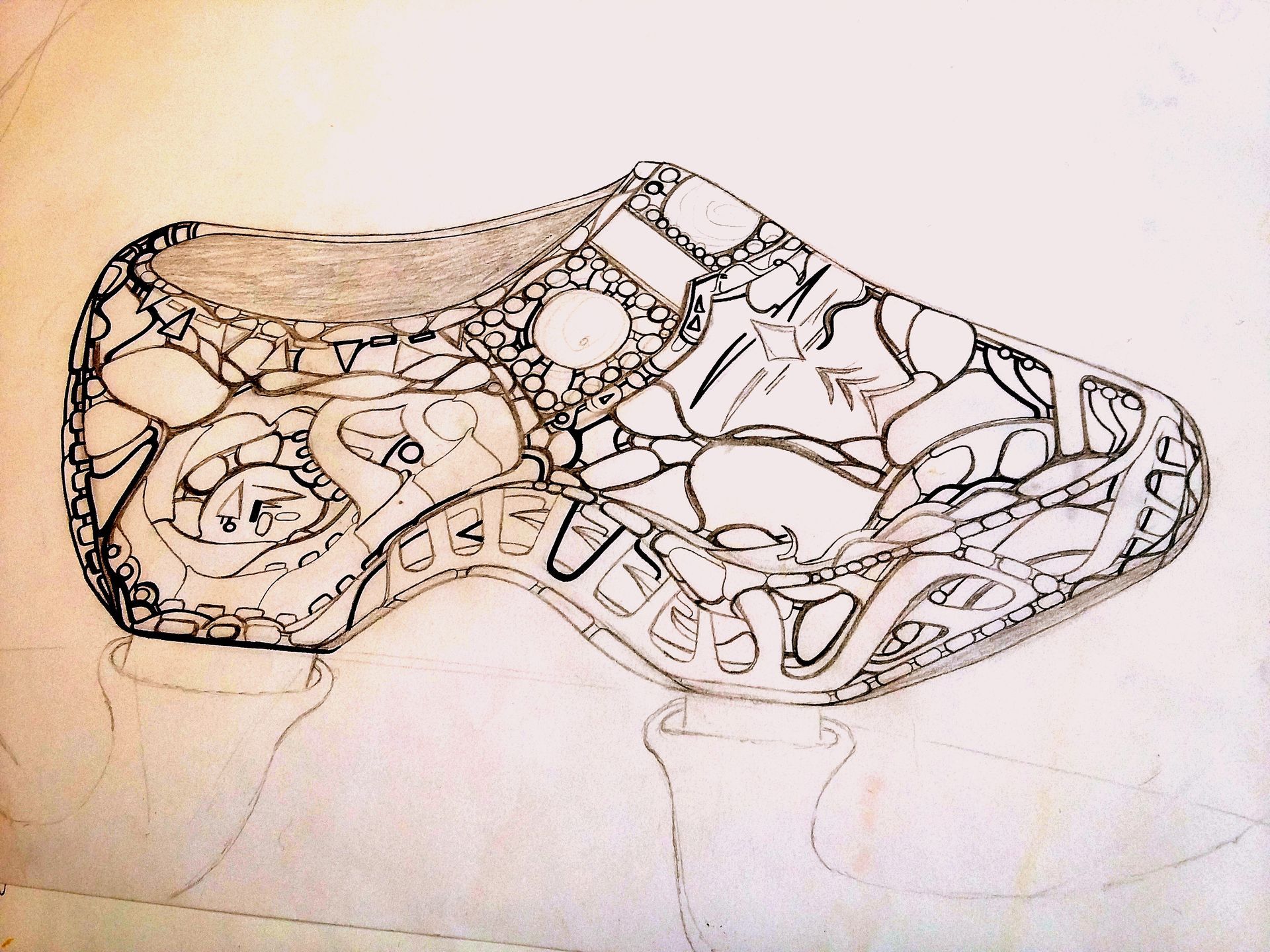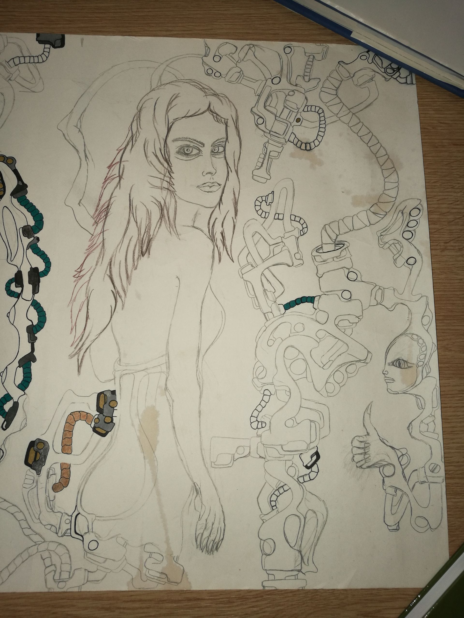 Dieses Bild ist ein spezieller Auftrag gewesen, es ging darum, die Real existierenden Beine samt den Schuhen des Models in meinem Stil wiederzugeben. Das ist für die Auftraggeberin am wichtigsten gewesen. Was meine Muster den Stil, alles, was man sieht, betrifft, so kann ich diesbezüglich das eine sagen, das es intuitiv kommt. Die verschiedenartigen Muster, das Sylische, kommt einfach. Es ergibt sich im Laufe der Arbeit. Wobei mir persönlich bei dem Projekt wichtig war, das man einen Zusammenhang erkennt.
