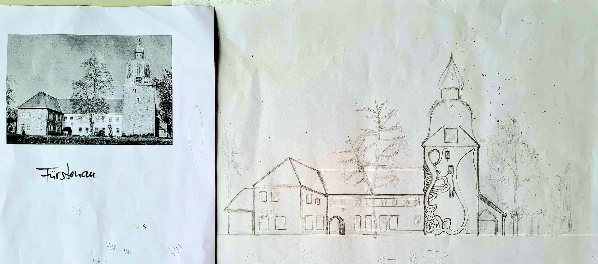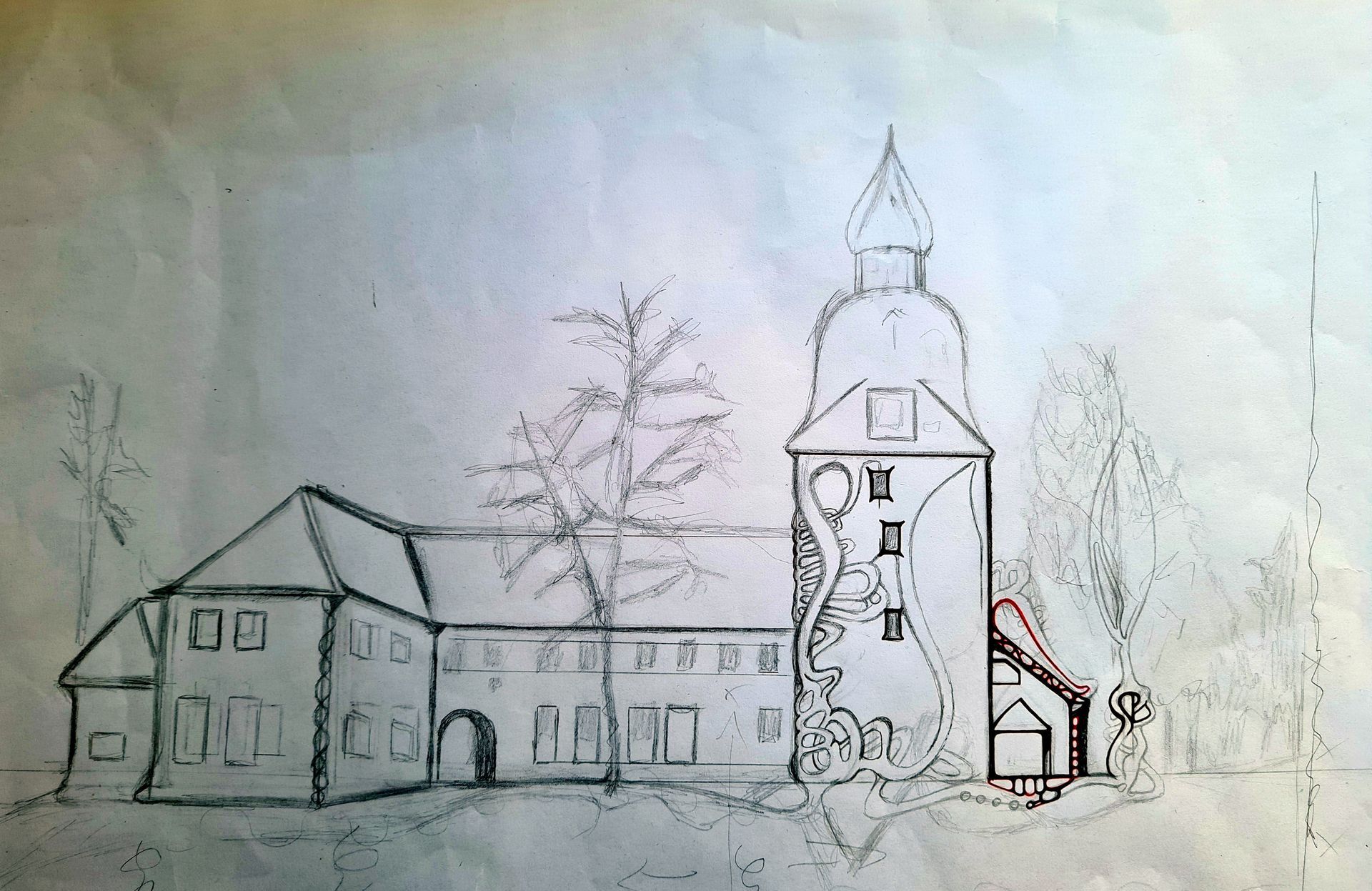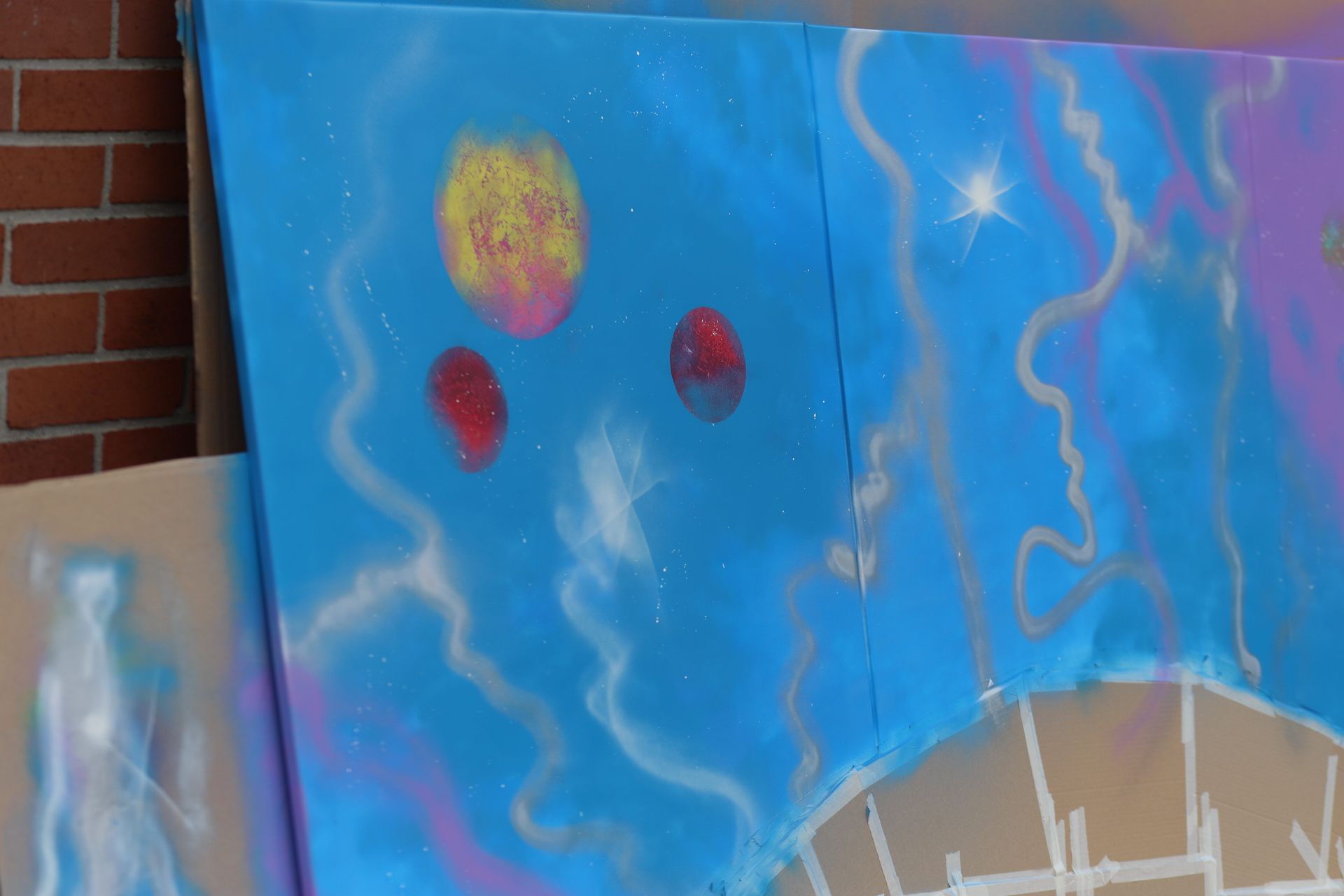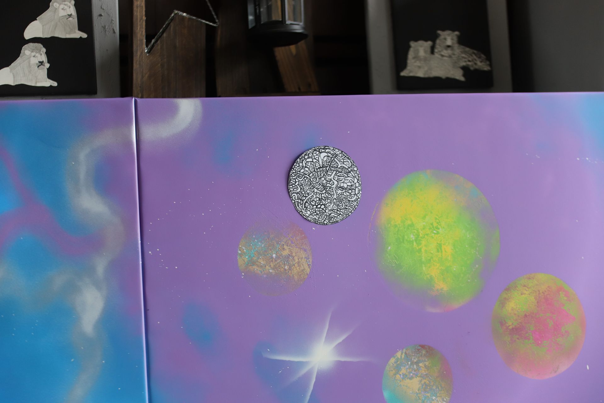 Dieses Projekt war eine Gemeinschaftsarbeit von insgesamt vier Künstler:innen, wobei einer auf eigenen Wunsch ausgestiegen ist. Die Gründe dafür sind unbekannt und nicht relevant für den Text. Ich selbst habe die Arbeiten am Bramscher Bahnhof, dem Tor in Quakenbrück, dem Kloster in Fürstenau, den Windrädern, den Planeten (einer wurde in Schwarz-Weiß gestaltet) sowie dem UFO (was letztendlich nur für unbekannte Flugobjekte steht) und dem Strahl (der keine Verwendung fand) gestaltet und umgesetzt. Vor der Bearbeitung habe ich die Leinwand kreisrund abgeklebt. Die Farben und der Aufstrich wurden von einem Künstlerkollegen und Freund übernommen. Im Nachhinein sind wir zufrieden.