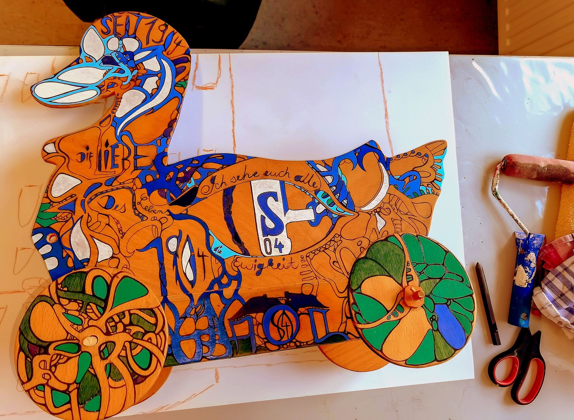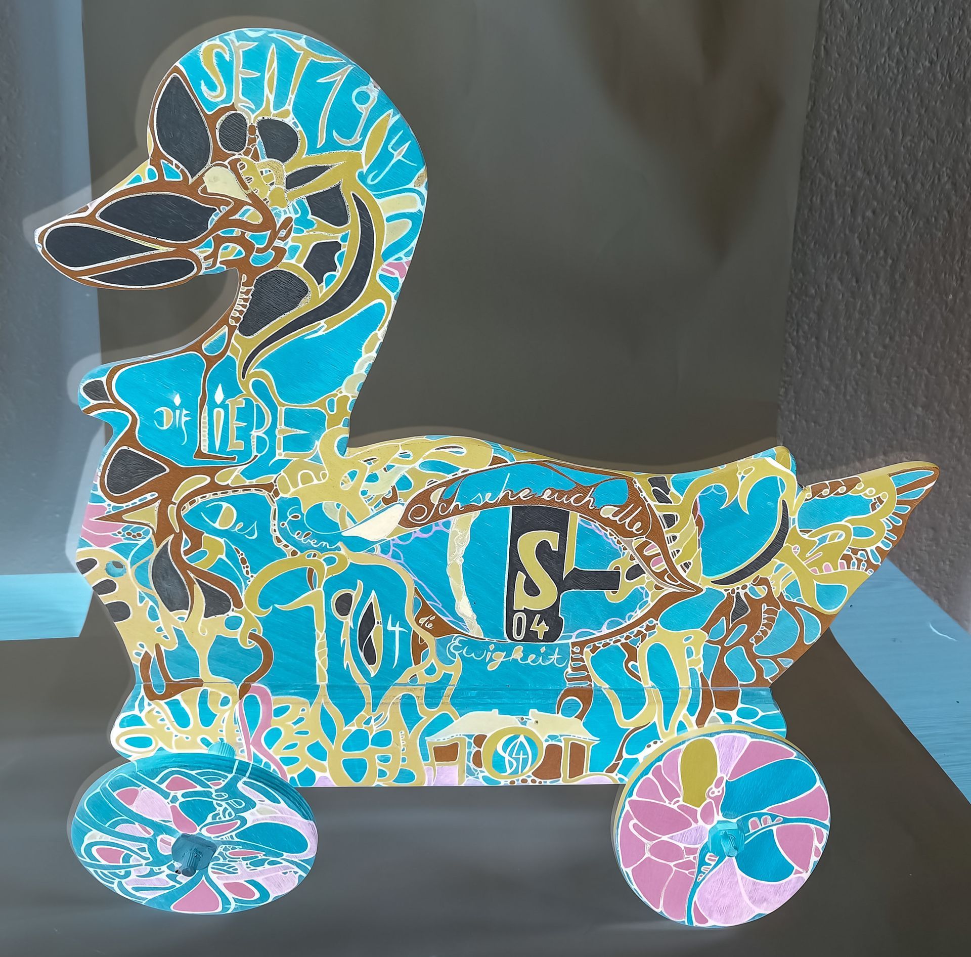 Etwas Stimmiges und Harmonisches also, ähnlich dem Neuen wird konkretes vorgestellt und zeigt dem Betrachter profundes. Es war wichtig, Kunstwerke - die in schwarz-weiß gezeichnet waren. auf die Figur aufzukleben, um das Besondere und Einzigartige zu zeigen.