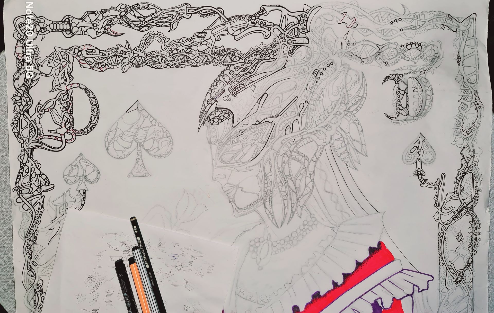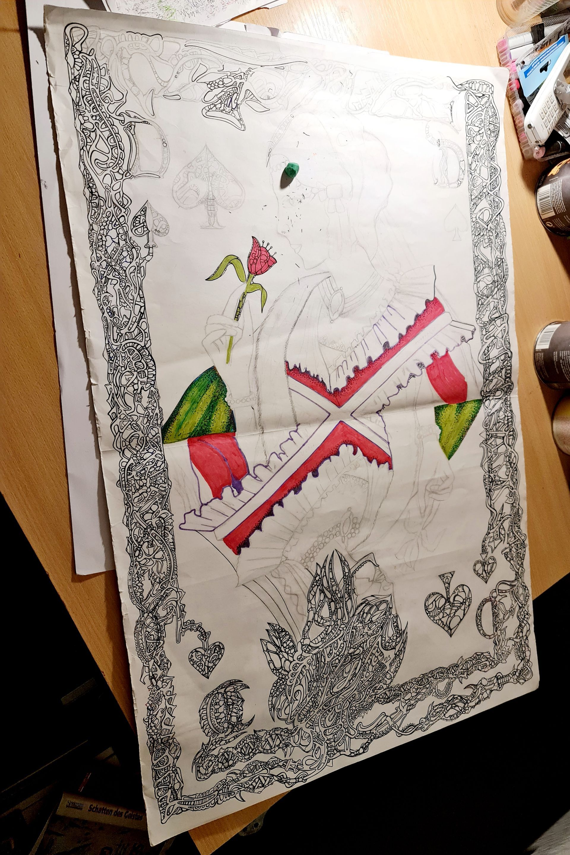 Auch diese zweite Spielkarte, die nach dem König gefertigt wurde, sollte in etwa gleich aussehen - zumindest rein von den Seiten her betrachtet: oben, unten, rechts und links. Das gesamte Umsetzen und Unterfangen an sich dauerte eine gewisse Zeit lang. So ca 50 Stunden. Dennoch bin ich mit dem Gesamtergebnis zufrieden. Es wurde nach und nach - im Verlauf der Arbeit, dem Prozess - einiges verbessert, ausgearbeitet und verfeinert. Auch erkennt man explizit, wie ich hoffe, die Strukturiertheit, das Detaillierte genauer und passender und wie sich alles ineinander fügt. Das nämlich ist ein wichtiges Element, wie es die integrierten Lianen verdeutlichen.