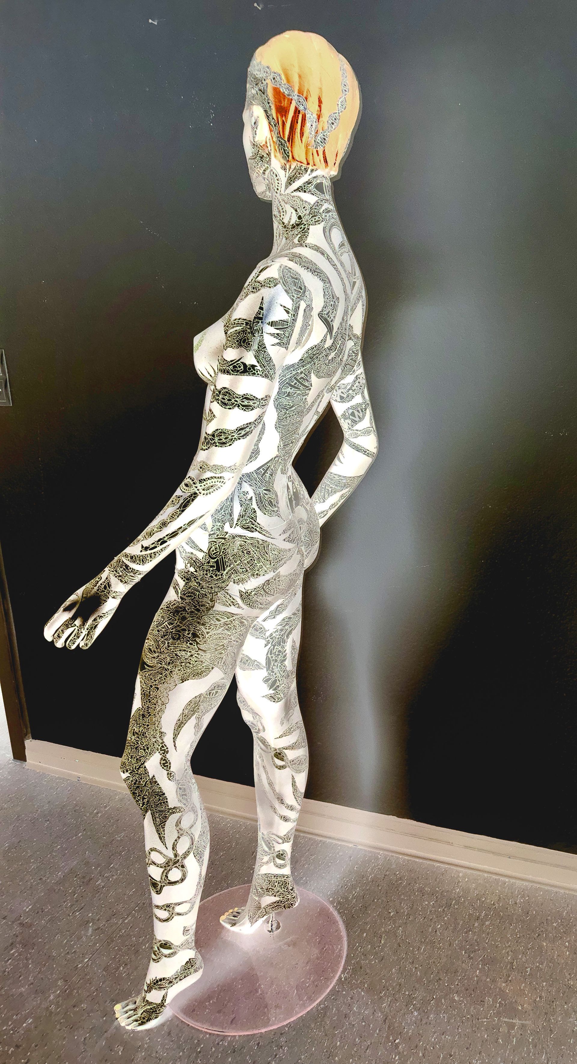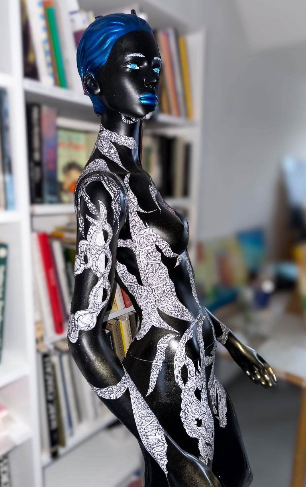 Diese Schaufensterfigur wurde in Weiß ersteigert. Anschließend wurden ihre derben Mängel und Kratzer, die ganzen Flecken, vereinzelte Brüche und Fehler, die an vielen Stellen bestanden, bearbeitet - korrigiert. Danach wurde die Figur, wie beim Torso, in Schwarz besprüht. Dann begann ich mit der Verfeinerung. Ich begann damit, den richtigen Kleber auszuwählen und zu bestimmen, welches meiner verschiedenen Kunstwerke am besten für die Figur geeignet ist.